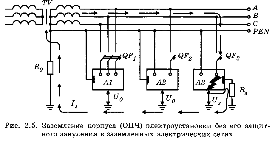 Общие требования, предъявляемые к защитному заземлению и защитному занулению. область применения защитного заземления и защитного зануления. Продолжение 1.Более того, поскольку в заземленных электрических сетях до 1 кВ (система заземления TN) обязательно должно быть выполнено защитное зануление корпусов электроприемников, то заземление корпуса одного из них без защитного зануления может привести к тому, что в аварийном режиме зануленные корпуса остальных ЭУ, питающихся от данного источника, могут оказаться под опасным напряжением UQ (рис. 2.5). Действительно, на нейтрали источника от тока замыкания 13 возникает падение на-пояжения